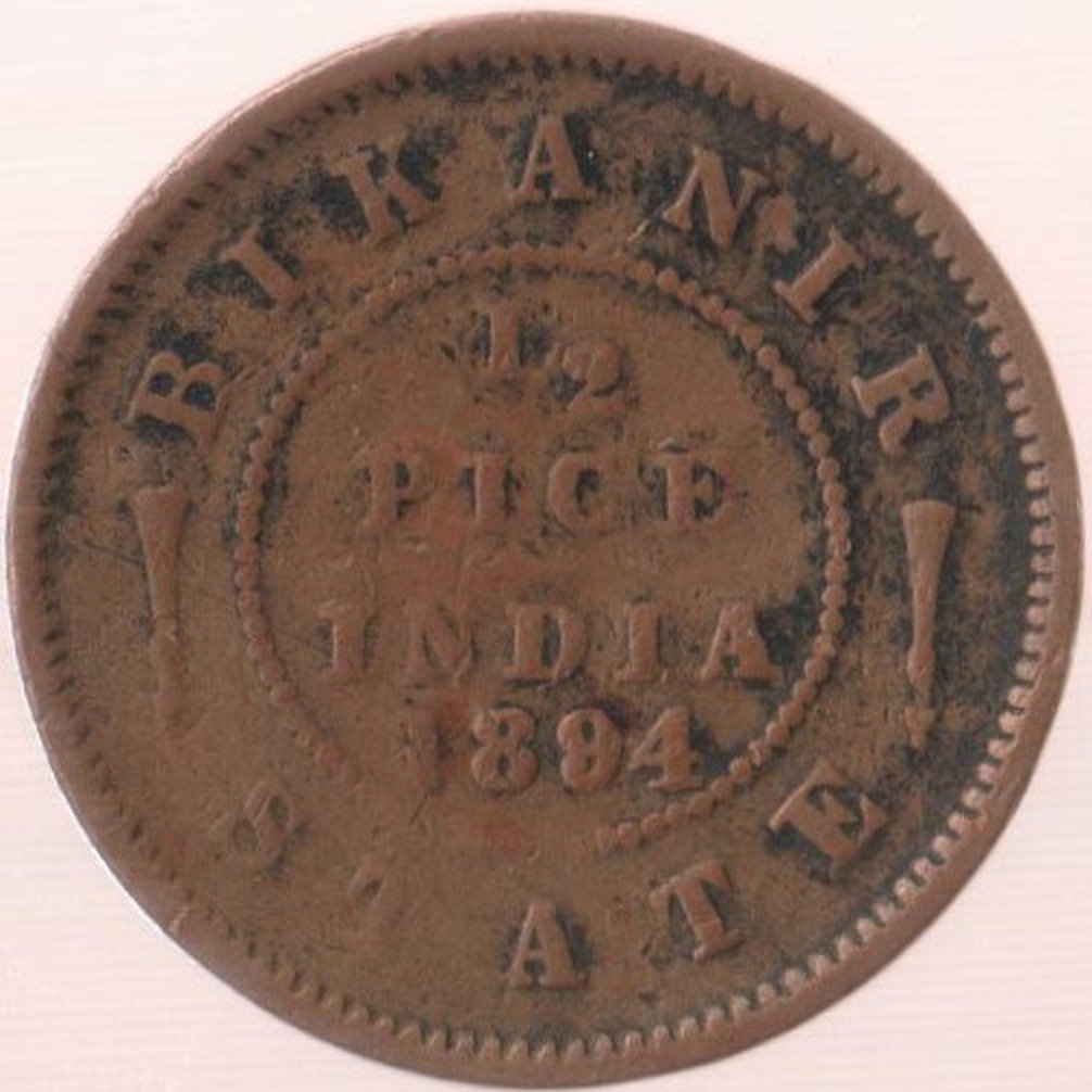 Extremely Rare 1/2 Pice 1894 of Bikaner State of Victoria Empress Copper Coin